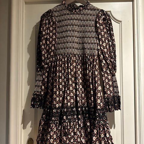 Klassisk kjole fra ByTimo med lengde til midt på leggen og et vakkert print som heter "Wallpaper". Den har v-hals, lange ermer og lukkes med knapper hele veien foran. Veldig flatterende passform med knyting i midjen. Skjørtet har volangkant nederst som gir fint fall.