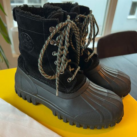 Dette er veldig praktiske og gode sko. De er foret med varm lammeull på innsiden, har en vanntett «underdel» og semsket skinn i toppen. Her får du tøffe sko om er perfekte til det skiftende norske været.