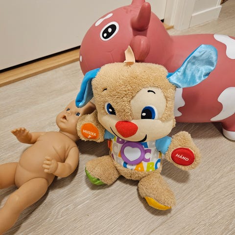 Fisher-Price Lekehund for barn, myk og fargerik med lydfunksjoner på hendene. Passer for små barn og bidrar til tidlig læring og lek.