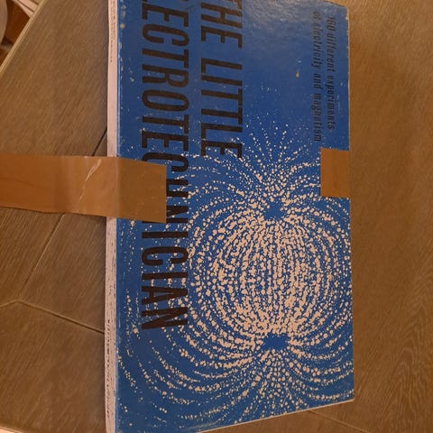 Den Lille Elektrikern eksperimentsett med 160 deler for elektrisitet og magnetisme. Settet inneholder ulike komponenter for å utføre elektriske eksperimenter, inkludert ledninger, batteriholdere, brytere og andre elektriske deler. Passer til utdanning og læring om grunnleggende elektriske prinsipper.
