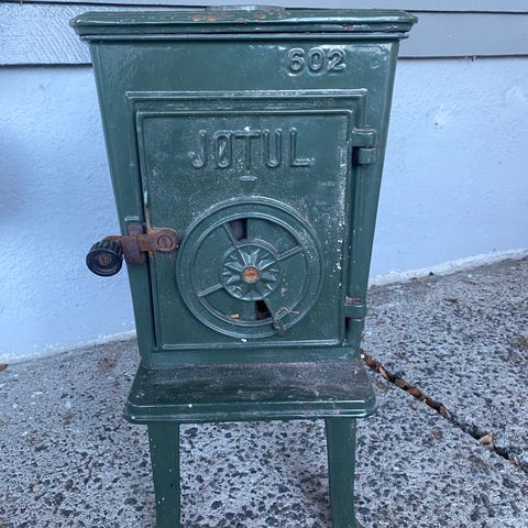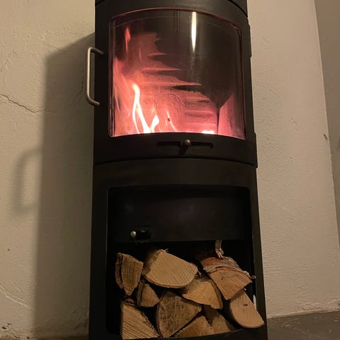 ABC dansk rentbrennende vedovn i svart metall med glassdør. Ovnen har en sirkulær form med røykutgang på toppen. Alle brennplater, skamol, intakte.
