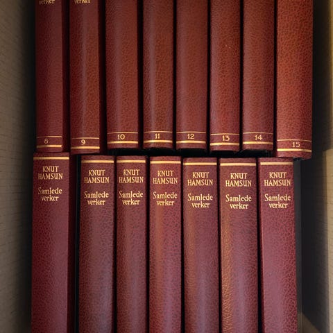 Selger komplett bokserie Samlede verker av Knut Hamsun, utgitt av Gyldendal Norsk Forlag.