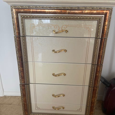 Selger med tungt hjerte hele sett i spisestua, skjenk med speil, kommode og spisebord siden jeg har lite plass hjemme. Den er laget av solid ved og produsert og fraktet fra Itly det er noen år gammel. Alt av nøyaktige målinger står på bildet.