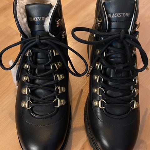 Blackstone vinterstøvletter i skinn med saueskinnsforing til salgs. Vibram såler. Høy kvalitet. Til dame. Pent brukt. Se bilder. Størrelse 39. Må sees og prøves i Bergen. Sendes derfor ikke.