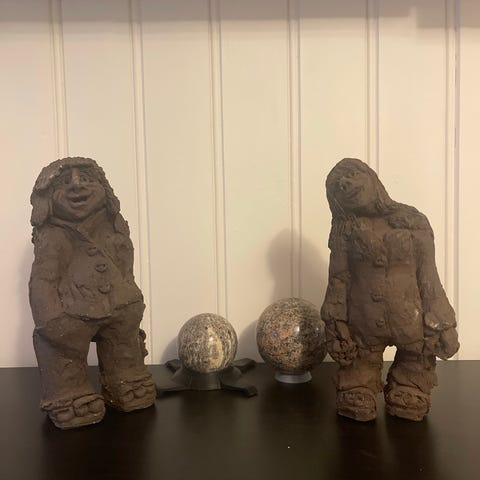 Sett med to trollfigurer laget i keramikk. Figurene har detaljerte ansiktstrekk og kropp, med ulikt uttrykk og positur. Hver figur har en solid base for stabilitet. Passer til dekorasjon og samling. Kan sendes men ikke fiks ferdig! Utrolig populære figurer !