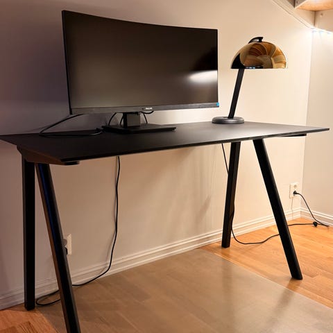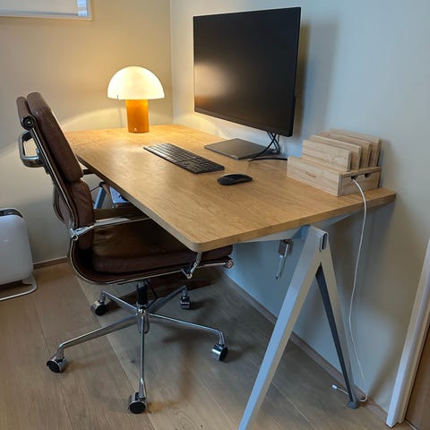 En flott skrivepult designet av Ronan og Erwan Bouroullec. Skrivebordet har noen merker på bordplaten som er i off- white linoleum, ellers velholdt. Resten av skrivebordet er i eik.