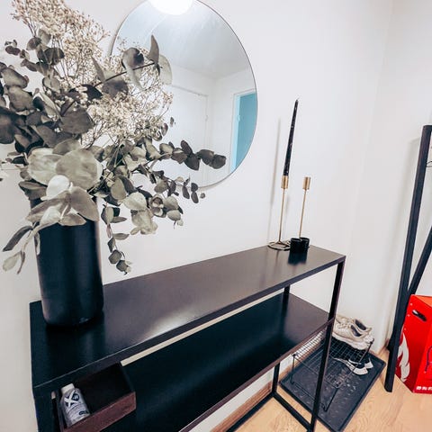 Selger en sort hylle som kan stå av seg selv. Den hadde veggfeste, men den ene siden har blitt knekt.