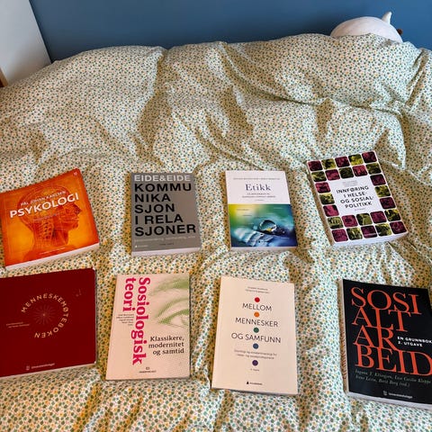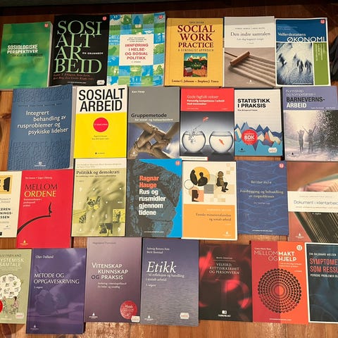 Relativt komplett samling av pensumbøkene jeg brukte på sykepleiestudiet 2016-2019.