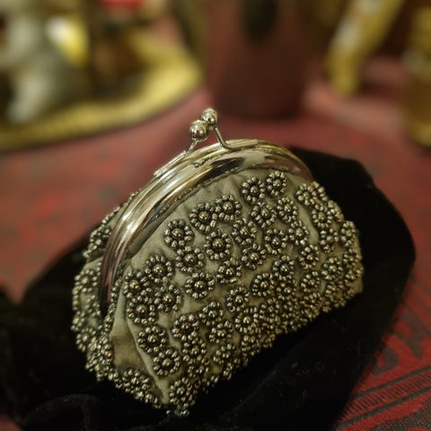 Pen portemone laget av vintage stoffer. Brukt som håndveske i et bryllup og ellers som dekorasjon.