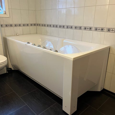 Boblebadekar i hvit farge med innebygde massasjedyser. Karret har flere justerbare dyser for vann- og luftmassasje, samt kontrollknapper for funksjonene.