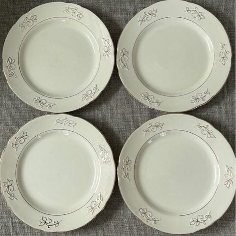 Sett inkluderer kopper og asjetter til 12 stk. følger med melkekanne og kaffekanne.