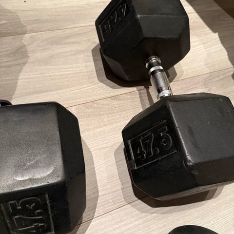 2 x 12,5 kg manualer med sekskantet form og svart gummibelegg. Manualene har metallhåndtak med grep. Egnet for styrketrening og generell trening. Ikke brukt. Er i plastikkpose enda.