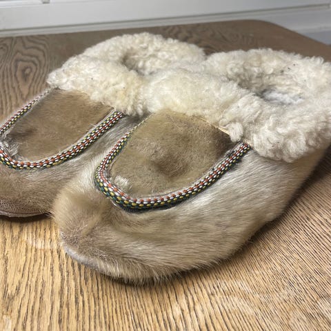 Selger disse samiske skallene laget av reinskinn. De har aldri vært i bruk og har ligget pent oppbevart i skap. Synes de er for fine til å ikke bli tatt i bruk. Jeg har str 39, men de passer fint til 38 også. God plass til å ha på en tykk lest eller ullkartanker om du har det. Selges for 850kr pluss porto.