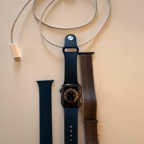 Apple Watch Series 7 smartklokke med Starlight aluminiumkasse og 41 mm størrelse. Leveres med Starlight sportrem. Smartklokken har funksjoner for helseovervåking og kommunikasjon. Klokken leveres i original eske, med lader. Klokkeremmen er beige og har fått litt missfarging. Ka hentes i moss eller sendes mot porto. Klokken settes opp til butikkstandard før salg. Batterikapasitet på 73%