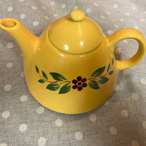 Selger en nydelig og dekorativ tekanne i en frisk gulfarge. Tekannen har et klassisk design med et vakkert blomstermotiv og grønne blader på begge sider.