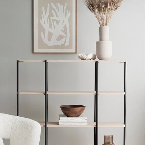 Hylle med stamme i pulverlakkert metall og 4 faste hylleplan i MDF med eikefinér. Bredde 120,5 cm, høyde 121 cm, dybde 30,5 cm. Høyde mellom hylleplan 33 cm. Maks belastning på hvert hylleplan er 20 kg. Leveres umontert.