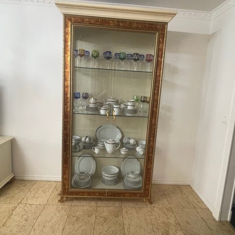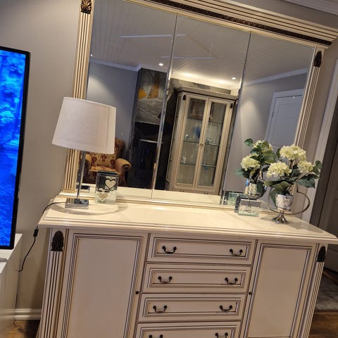 Selger med tungt hjerte hele sett i spisestua, skjenk med speil, kommode og spisebord siden jeg har lite plass hjemme. Den er laget av solid ved og produsert og fraktet fra Itly det er noen år gammel. Alt av nøyaktige målinger står på bildet.