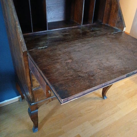 Naturfarger skatoll med 4 skuffer, nedfallbar skrivelem, små skuffer bak lemmen. I god stand. Står på en sokkel. Høyde 101cm, bredde 104 cm, dybde 51 cm