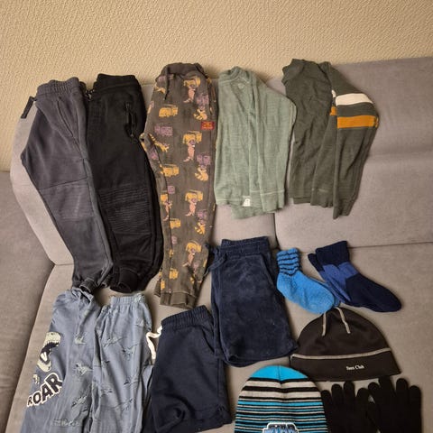 Klespakke i str116-134. Det er noe kler i 116 det meste er 122-128. Ene jakka er 116.