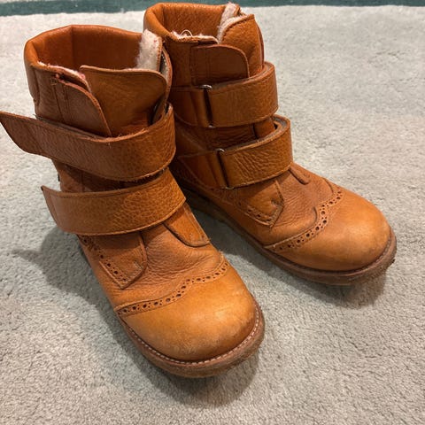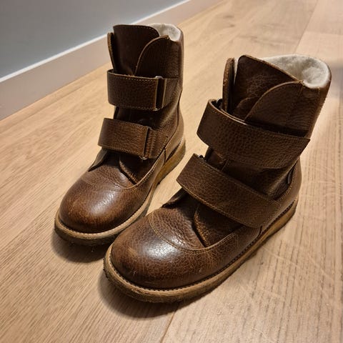 Angulus mye og lette vintersko i skinn med ullfor. TEX-membran. De ble for små før vi fikk tatt dem ordentlig i bruk. Ny pris ca 1700.
