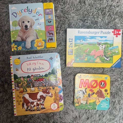 Perfekte hjelpemidler for sanseutvikling for de aller minste! Store bildekort i høy oppløsning med mange forskjellige dyr. Bok om farger med eksempler på norsk. Ta-og-føl, bøker på engelsk, "this little puppy" og boksamling med shapes, colors, numbers og words. Kan hentes på Billingstad i Asker eller på Oslo S.