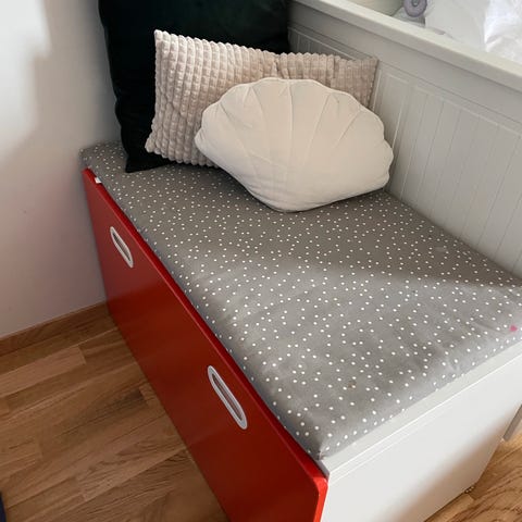 IKEA Juniorseng for barn. Pent brukt. Et par riper i lakken/bruksmerker (se bilde). Følger med to madrasser hvorav den ene er overmadrass. Lite brukt og god å ligge i.