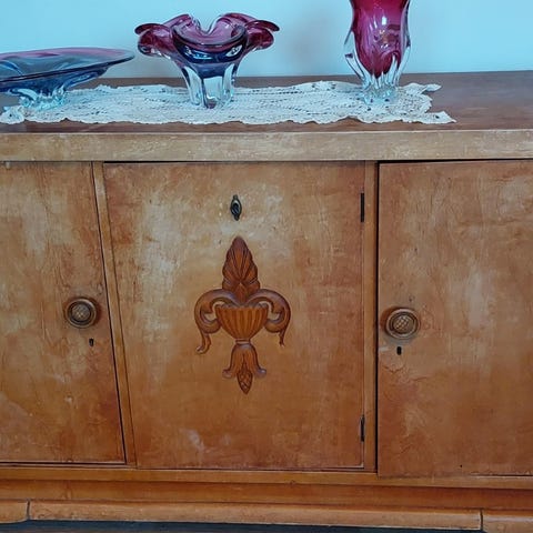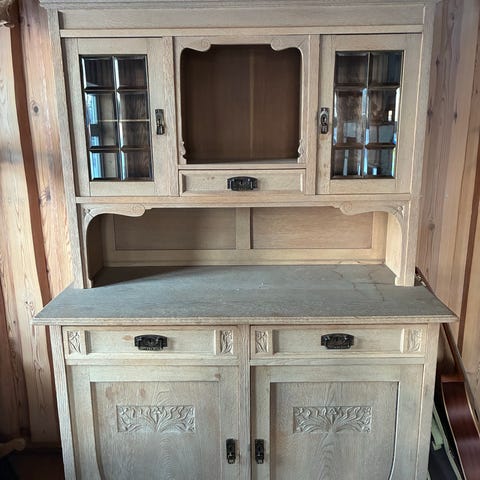 Sjenk i beige med fire skuffer og fire skapdører. Møbelet har en rettlinjet design i gustaviansk stil. Skuffene har trehåndtak og er foret med grønt stoff. Skapet har en hylle innvendig på hver side for ekstra oppbevaringsplass. Var opprinnelig blått, men ble malt i fargen Marrakesh utvendig. Trenger et strøk ny maling,men er ellers uten skader.