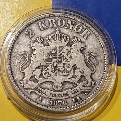 Selger en 2 kr fra 1876 i sølv avbildet Oscar II Sveriges O. Norges Konung. Vekt:14,6 g