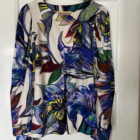 Ane Mone skjorte i oransje farge, laget av 95% silke og 5% elastane. Skjorten har størrelse 40, romslig i størrelsen. Skjorten er bare brukt noen timer en kveld, selges fordi jeg ikke synes fargen kler meg. Prisen inkluderer frakt.
