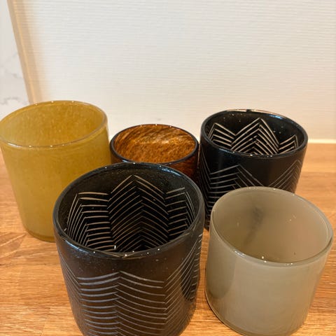 3 telysestaker i glass fra Ment på Fåberg. Like fine. De lager også kopper i samme stil.