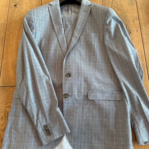 SAND Copenhagen dress i beige laget av 100 % lin. Jakken er herremodell i størrelse 50. Den har et klassisk snitt med to knapper og lomme på innsiden. Fôret er blått med mønster. Jakken egner seg til formelle og uformelle anledninger og både bukse og jakke kan fint brukes separat.