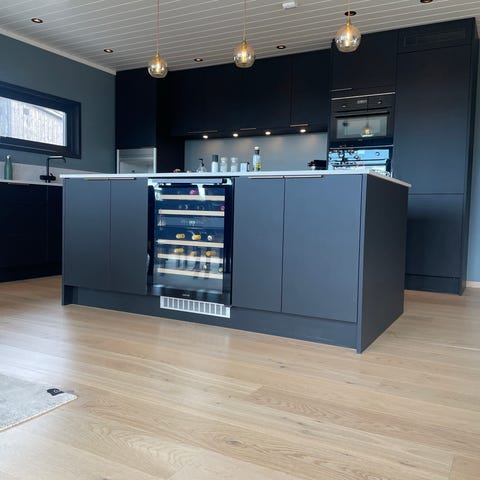Fin innredning i fronten Elfi mørk mokka med 20mm laminat benkeplate. Underlimt franke 610-52TL vask og Blanco Lanora S kran medfølger. Håndtak og knotter er Beslag design helix stripe i sort. Led stripe under overskap.