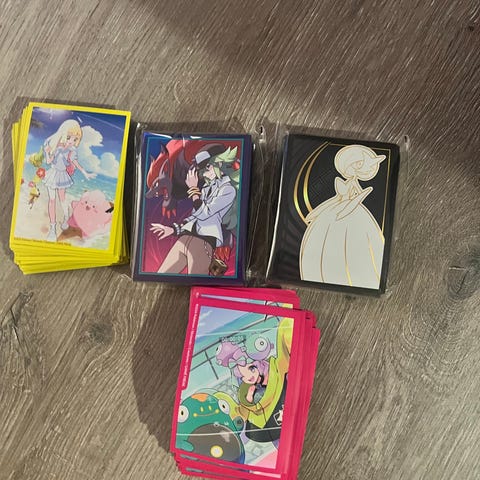 Dobbeltsleevet kort og bunke med sleeves og harde sleeves med boks. Tatt rett inn i sleeve etter åpning