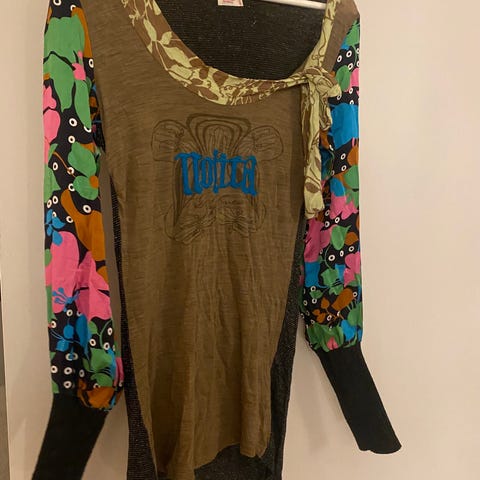 Unik genser med grafisk mønster og dekorative knapper, kjøpt i Paris for et par år siden. Styles kult over en hvit skjorte, for eksempel. Det er ingen merkelapper i genseren, men det føles som ull.