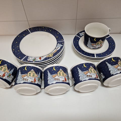 Et enkelt og pent frokostservise fra interiørbutikken Feel. Serviset ble kjøpt til jul, men selges nå grunnet flytting. Serviset består av 8 kopper, 8 tallerkner og to boller. Selges samlet. Kan sendes mot at kjøper betaler frakt. Bruker ikke fiks ferdig eller helt hjem.