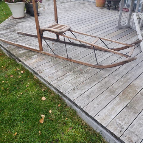 Gammel nostalgisk stor tre-spark. Flott patina, solid.