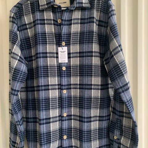 Øverste knapp rett under kragen mangler. Ellers hel og pen ✨️