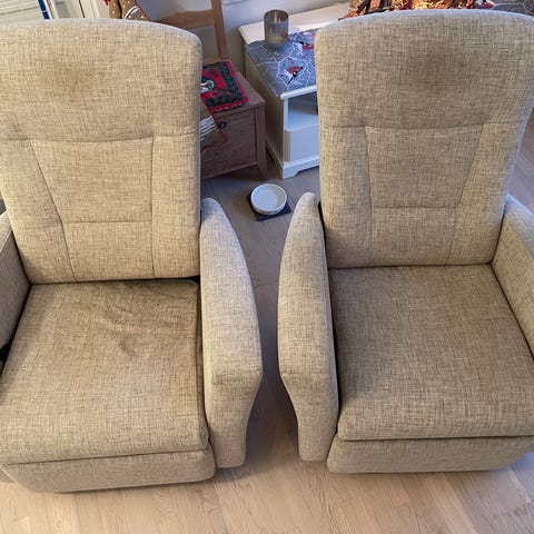 Pen Hjellegjelde lenestol i lyst skinn med krakk.