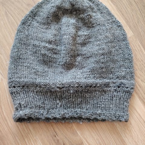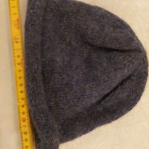 Hjemmestrikket lilla lue i ull for dame, stor i størrelsen. Luen har en strukturert strikket tekstur og en brettet kant.