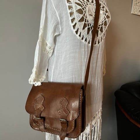 Pent brukt sett i forhold til alder, med normale bruksspor som gir den et autentisk vintage-preg. Lukkes med metallspenne. Romslig og praktisk.