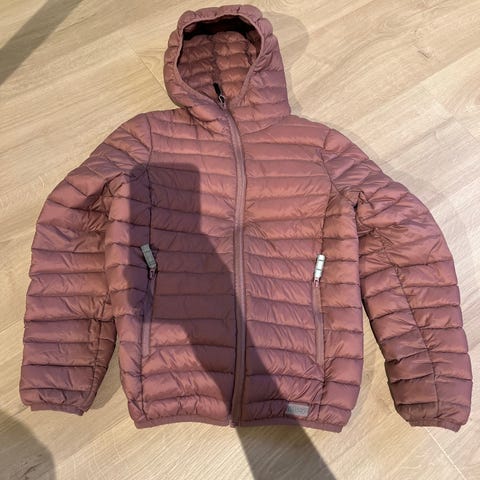 Reflex tynn dunjakke str 146. Pent og lite brukt. To små prikker fra en penn ved glidelåsen (se bilde 3). Hentes på Flisnes eller sendes mot porto.
