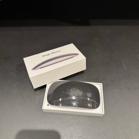 Apple Magic Mouse tilleggsutstyr i hvit og sølvfarge. Trådløs mus med glatt overflate og minimalistisk design. Passer til Mac-enheter og andre kompatible datamaskiner.