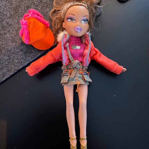 Bratz dukke med langt brunt hår, iført en blå blomstret topp og lyseblå jeans med broderier av blomster og skjold. Dukken har detaljerte ansiktstrekk og sko i lys farge. Egnet som samleobjekt eller lek. Yasmin Bratz med orginal klær