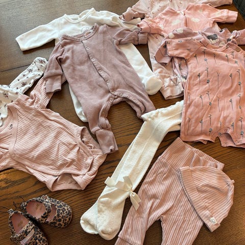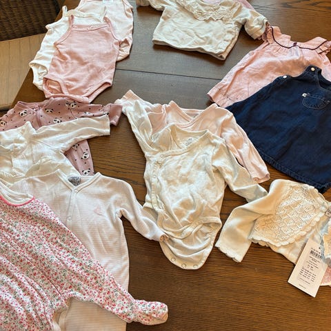 Petit Bateau barneklær og andre gode merker for jente i størrelse 68, i rosa farge. Inneholder ulike plagg som bodyer, dress, kjole, egnet for små barn.