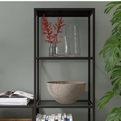 Hyllen har et rent og enkelt design og er laget av herdet glass og metall. Den har justerbare ben, står stødig også på ujevne gulv.