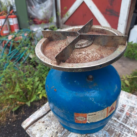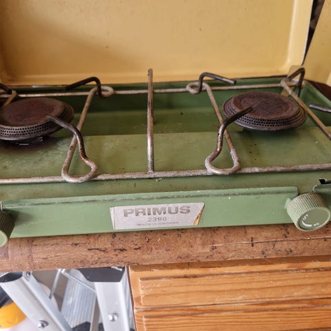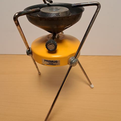 Primus 2222 Primus-Sievert AB kokeapparat i gul og oransje farge. Bærbar kokeapparat med to brennere, egnet for utendørs bruk. Metallmateriale med bærehåndtak, designet for enkel transport og bruk.
