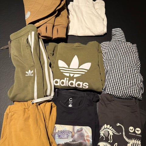 Fin klespakke med Hummel genser, t-skjorte, Adidas hettegenser og bukse sett i svart farge, størrelse 116 for gutt. Noen bruksspor og mindre hull på buksen, som vist på bilder. Ellers er de andre buksene uten hull.
