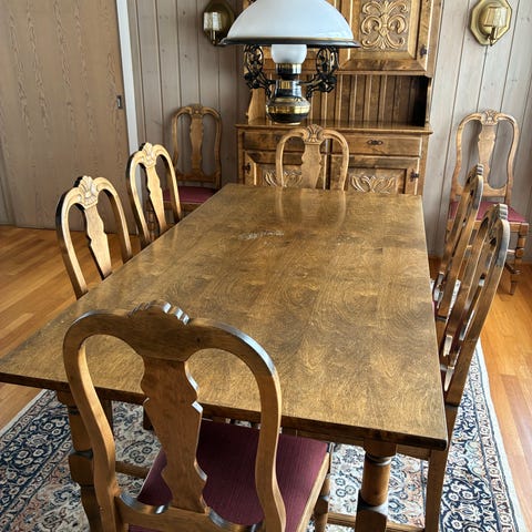 Gammelt spisebord med to ileggsplater på 30 cm hver og 7 stoler. To av stolene er med armlene og de andre er uten.