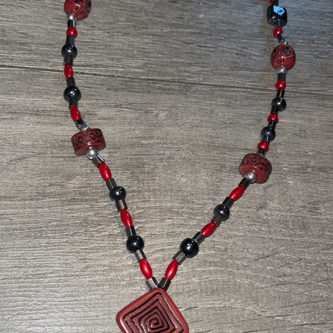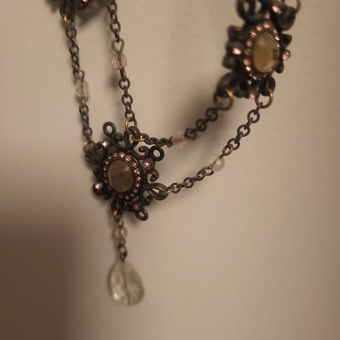 Fin smykke med kunstige stener og gun metall farge på metallet.