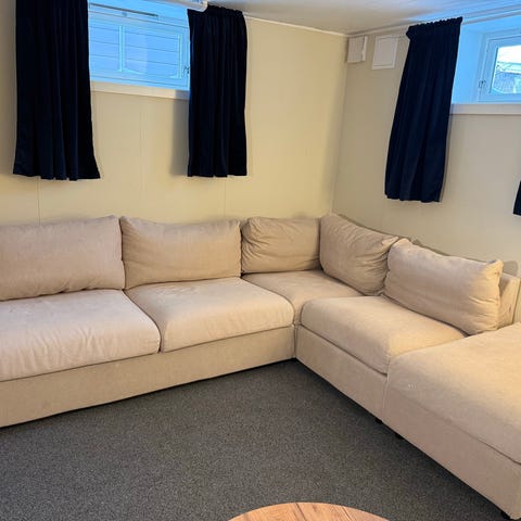 En av sofaputene har misfarging på undersiden pga en mislykket vask av en flekk. Sofatrekkene kan vaskes forsiktig i vaskemaskin eller med en møblerenser med damp.